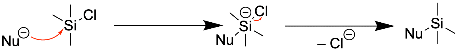 Silizium befindet sich in der dritten Periode und geht deshalb keine simple SN2-Reaktion ein. Vielmehr handelt es sich um einen Additions-Eliminierungs-Mechanismus, vergleichbar mit dem an einer Carbonyl-Gruppe.