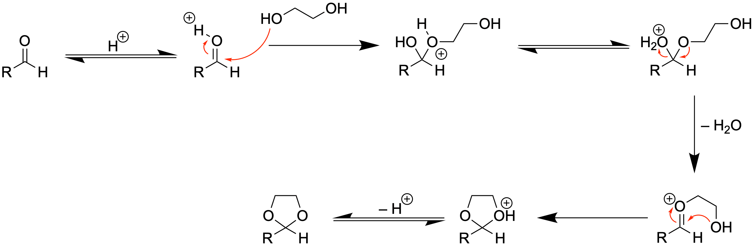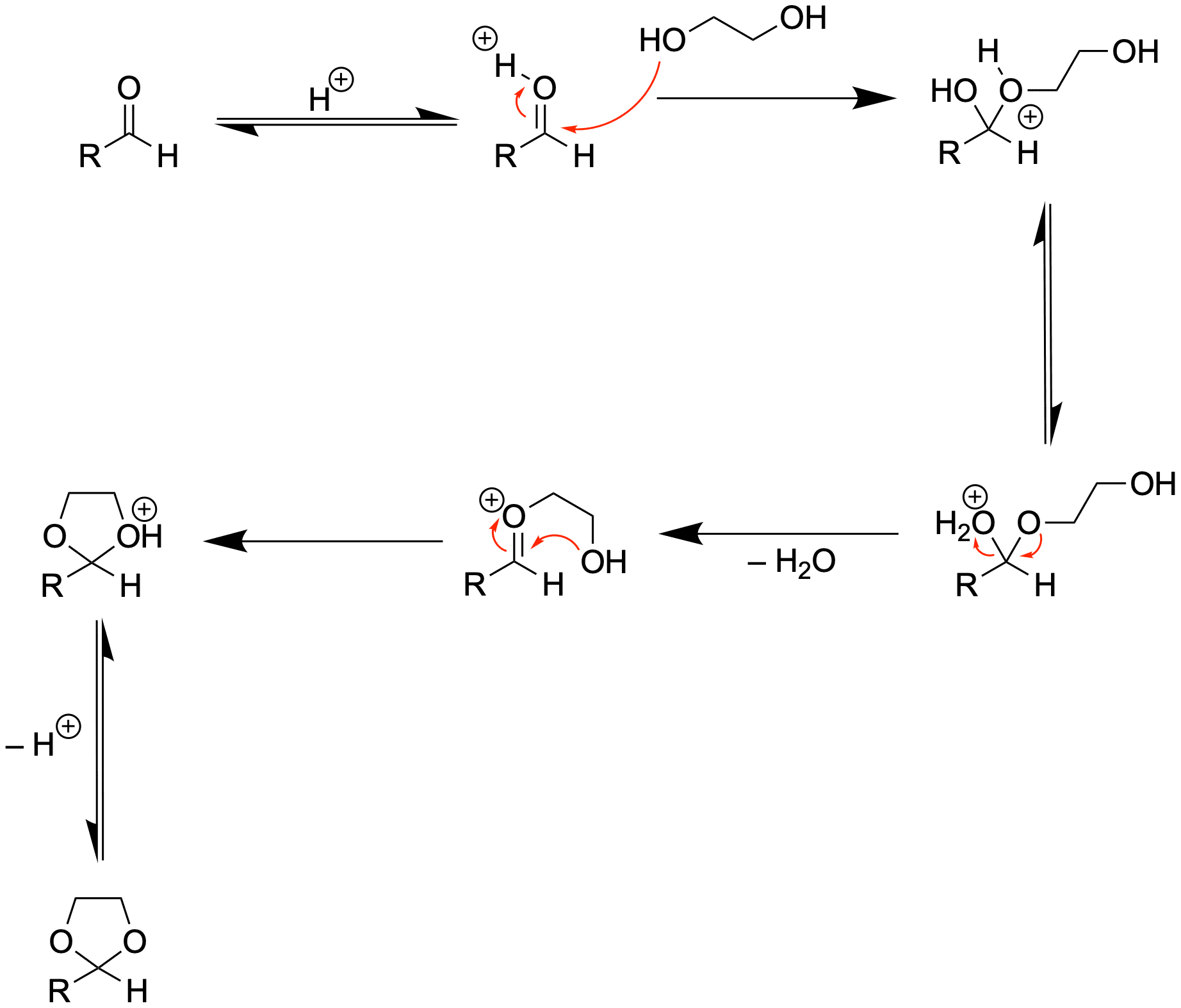 Es ist tatsächlich mit einer verkürzten Reaktionsgleichung wie oben nicht ersichtlich, warum sich ein Acetal bilden sollte, wenn dasselbe Acetal wieder mit Säure entfernt wird.