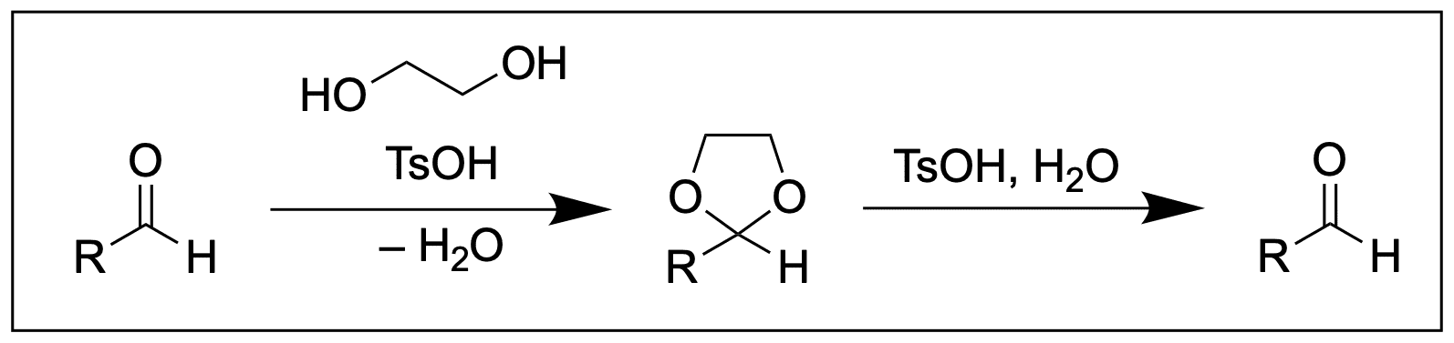 Ketone und Aldehyde lassen sich am einfachsten durch Acetale schützen. Hierfür wird entweder Ethylenglykol eingesetzt, wodurch ein 1,3-Dioxolan gebildet wird, oder 1,3-Propandiol zur bildung eines 1,3-Dioxans. Zum Entschützen wird mit wässriger Säure aufgearbeitet. Die Schützung sieht mechanistisch wie folgt aus: