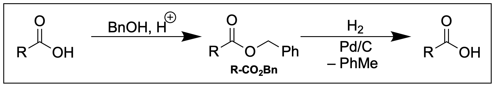 Benzylester (abgekürzt -CO2Bn) lassen sich mit Benzylalkohol darstellen und sind labil gegenüber Hydrogenolyse. Werden sie mit Wasserstoff und Palladium auf Kohle behandelt, wird die Carbonsäure unter Freisetzung von Toluol entschützt.