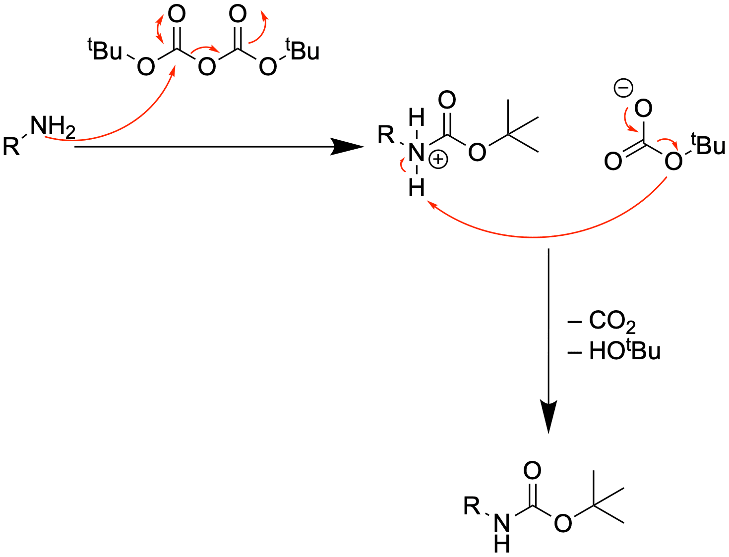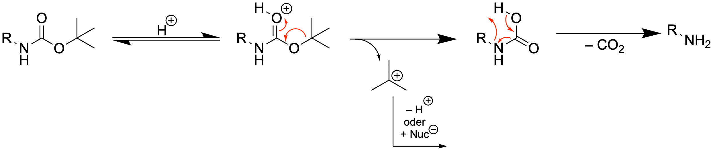Die Boc-Gruppe lässt sich mit Säure wieder entfernen, analog zum tert-Butylester bei Carbonsäuren. Der Grund ist auch hier, dass im sauren Milieau eine E1 oder SN1 Reaktion stattfinden kann.