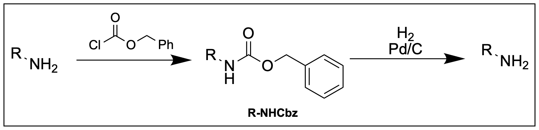 Als letztes orthogonale Schutzgruppe fehlt noch die Cbz-Gruppe (oder nur Z-Gruppe). Sie ist das analogon zum Benzylester und somit H2-labil. Angebracht wird sie über das Carbonylchlorid Cbz-Cl.