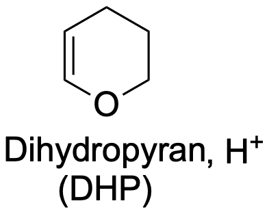 Als letztes Beispiel gibt es noch die Tetrahydropyranyl-(THP-)Schutzgruppe, welche sich über eine elektrophile Addition an Dihydropyran (DHP) anbringen lässt: