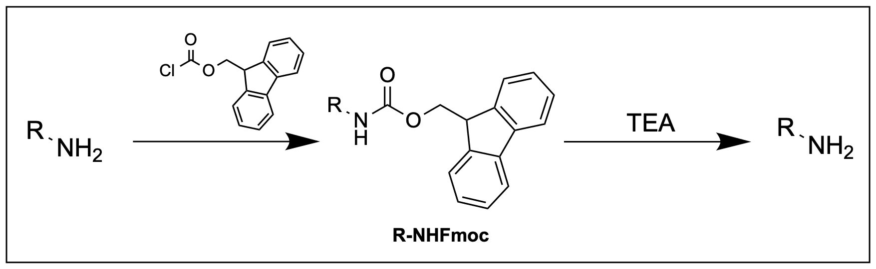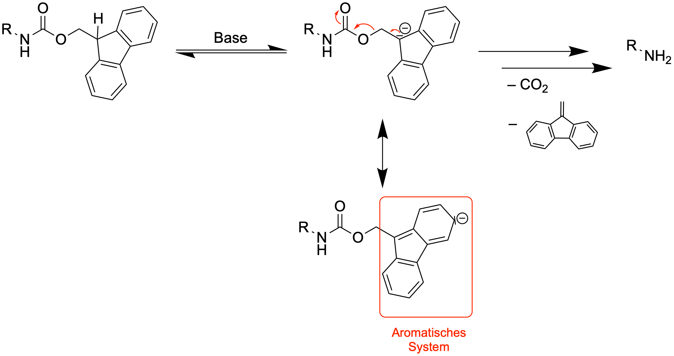 Die Fmoc-Gruppe ist stabil gegen Säuren, trägt jedoch ein verhältnismäßig acides Proton (pKA≈25). Die konjugierte Base trägt über drei Ringe verteilt ein durchgehend aromatisches System , was die Deprotonierung stark begünstigt. Insgesamt kann somit eine E1cb-Reaktion stattfinden, und erneut eine labile Carbaminsäure dargestellt werden, welche zum Amin zerfällt.