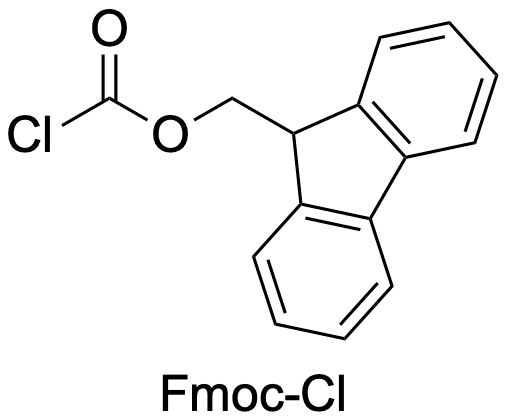 Eine Schutzgruppe, welche basenlabil ist, ist die Fluorenylmethoxycarbonyl-Schutzruppe (kurz Fmoc-Gruppe, ausgesprochen "Eff-mock"). Zur Schützung wird vom Carbonyl-Chlorid Fmoc-Cl ausgegangen.