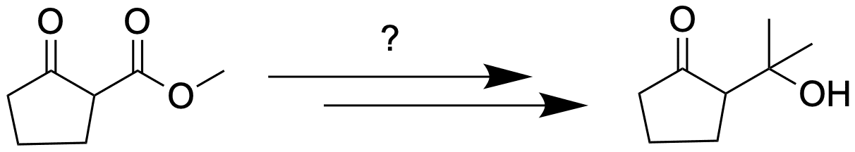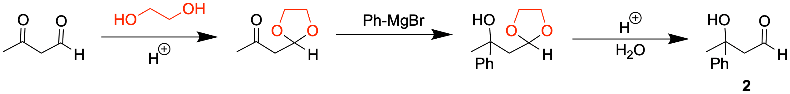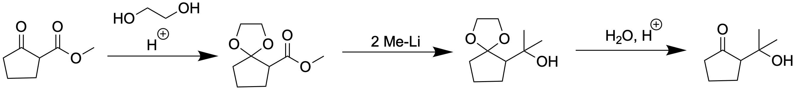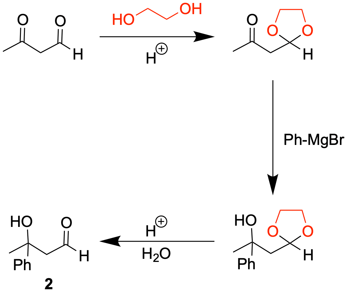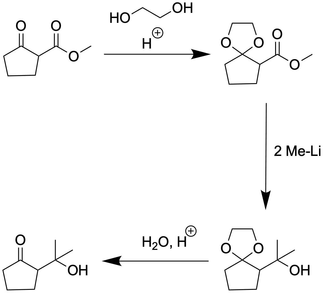 Die Keto-Funktion reagiert schneller mit Nucleophilen als der Ester, weshalb hier per Acetal geschützt werden muss. Die Reaktion von Estern mit Metallorganylen liefert den tertiären Alkohol, da nach Reaktion mit bspw. MeLi ein Keton entsteht, welches wiederrum reaktiver ist als der Ester von dem ausgegangen wurde.