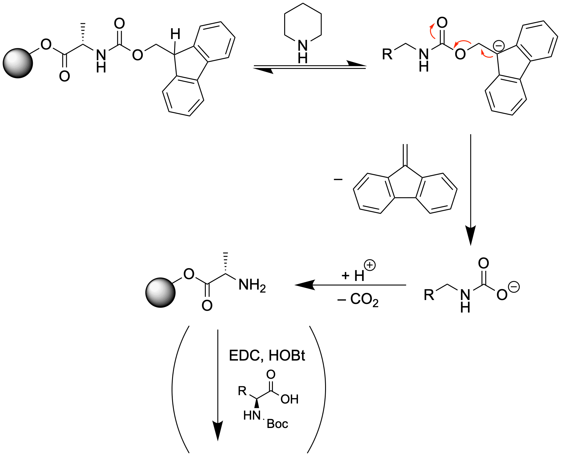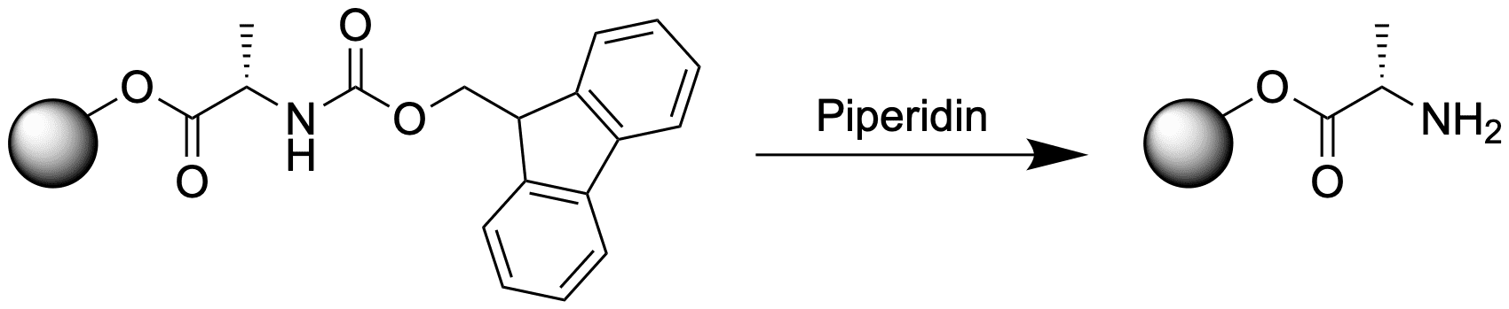 Piperidin ist eine Base und kann somit die E1cb-Reaktion zur Abspaltung der Fmoc-Gruppe initiieren. Nach Deprotonierung entsteht ein aromatisches 14-Elektronensystem, welches über die drei Ringe der Fmoc-Gruppe verteilt ist.