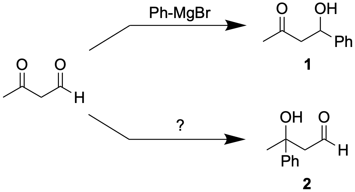 elektrophiler ist, sollte klar sein. Somit wäre bei der simplen Reaktion mit einem Phenylmagnesiumbromid das Produkt 1 als Hauptprodukt zu erwarten. Doch was, wenn die Verbindung 2 benötigt wird? Genau für sowelche Fälle kommen Schutzgruppen zum Einsatz.