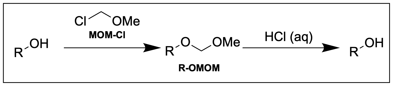 Als letztes kommen wir erneut auf Acetale zurück, denn auch Alkohole lassen sich auch Prima als Acetal schützen. Bezüglich der Stabilität gilt dasselbe, wie oben bereits beschrieben. Ein Beispiel ist die Methylmethoxy- oder auch MOM-Schutzgruppe: