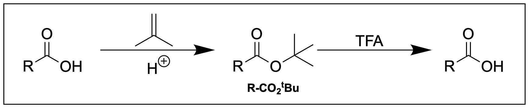 Normale Alkylester wie ein einfacher Ethylester schützt vor schwachen Säuren und ist über die konventionelle Veresterung anzubringen und über die säurekatalysierte Verseifung wieder zu entfernen. Sie sind eine einfache Möglichkeiten, um der Carbonsäure ihre Acidität zu nehmen, und sie somit Resistent gegenüber Elektrophilen wie Carbodiimide (EDC, DCC) o.Ä. zu machen. Aufregender wird es, wenn wir den Ethylester durch einen tert-Butylester ersetzt wird: