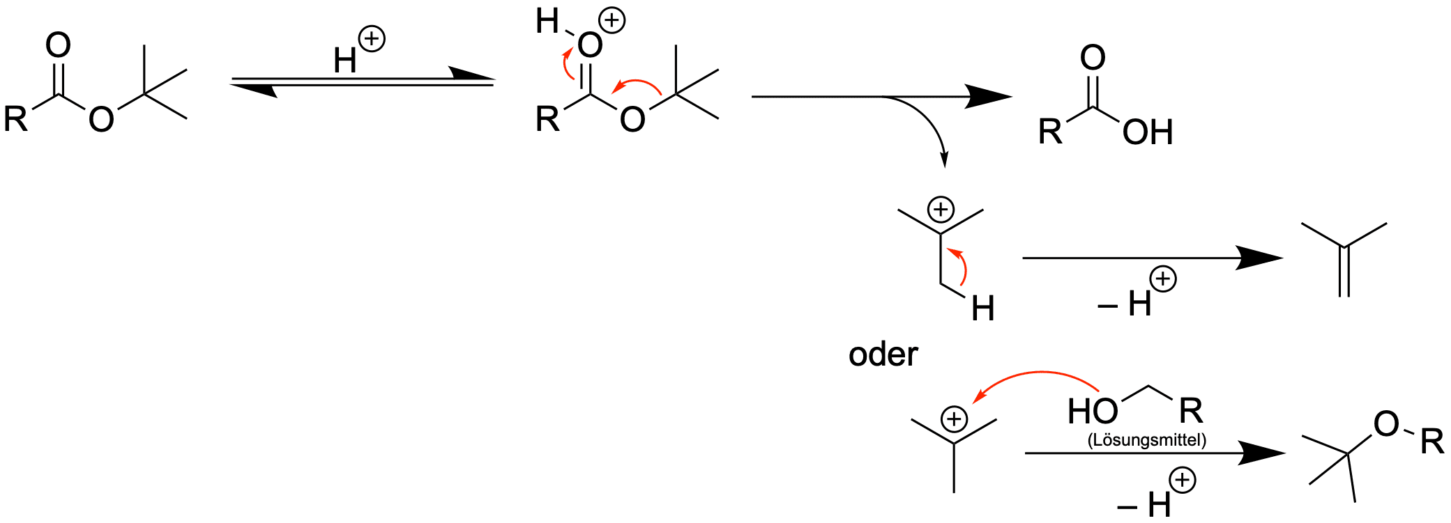 Der tert-Butylester (abgekürzt -CO2tBu) ist säurelabil, da das tert-Butylium-Ion verhältnismäßig stabil ist und somit eine Eliminierung (E1) (oder SN1) stattfinden kann, wodurch Isobuten entsteht.