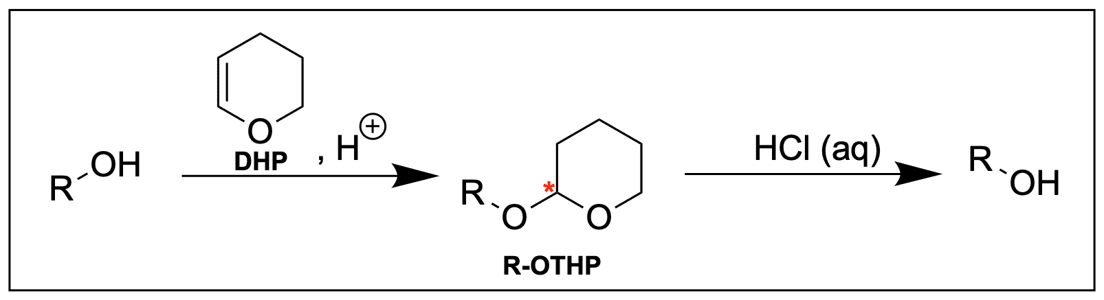 Ein Problem, dass die THP-Schutzgruppe mit sich bringen kann, ist, dass am THP-Rest ein stereogenes Zentrum (rot) vorliegt. Dies muss nicht von Bedeutung sein; wird jedoch mit chiralen Verbindungen gearbeitet, so werden mit der THP-Schutzgruppe auch Diastereomere gebildet, was die Kinetik von Reaktionen oder bspw. das Kristallisationsverhalten beeinflussen kann. Wir fassen zusammen: