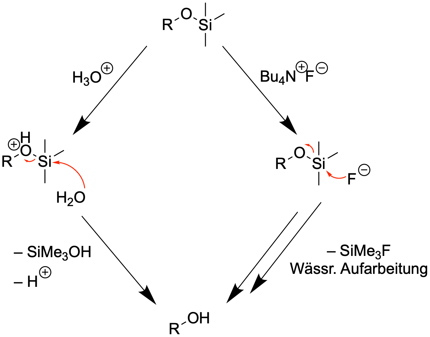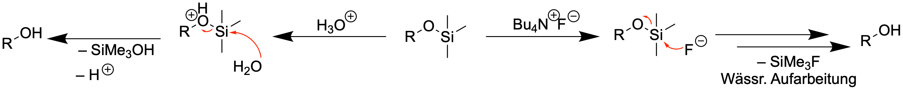 Zur Entschützung wird häufig ein Flourid-Salz eingesetzt, welches löslich in organischen Lösungsmitteln ist, wie Tetrabutylammoniumflourid (TBAF), oder wässrige Säure, wenn möglich.
