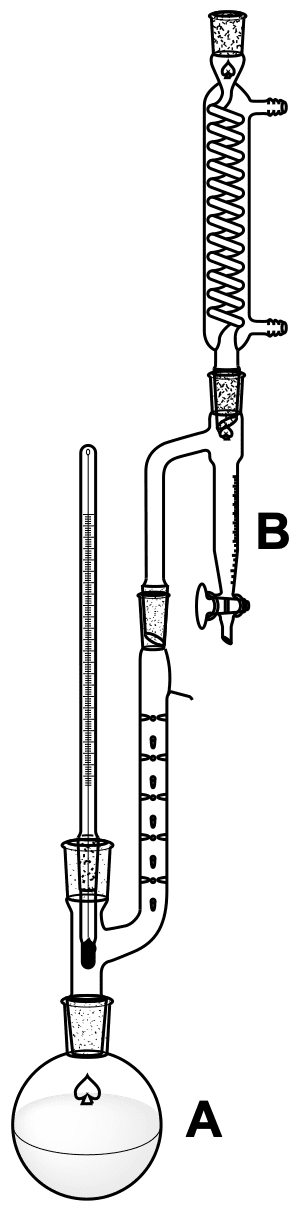 Das organische Lösungsmittel schleppt beim Sieden das Wasser aus dem Reaktionsgefäß A, welches hochsteigt und in das Syphon B kondensiert. Dieses ist selbst mit Lösungsmittel gefüllt. Da Wasser eine höhere Dichte als die meisten organischen Lösungsmittel hat, wird es dort zu Boden sinken und das Lösungsmittel verdrängen, welches wieder hinunter zum Reaktionskolben fließt: